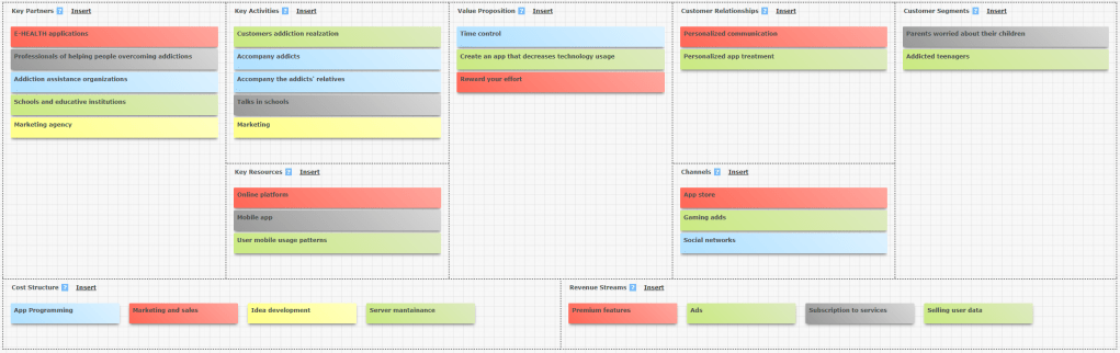 Our project requires to maintain a relationship with other businesses that are described in Key Partners. These are E-health applications, professionals in order to help people with the addictions, also schools and educative institutions, a marketing agency in order to promote us, and addicion assistance organization in order to help our users affected by technology.